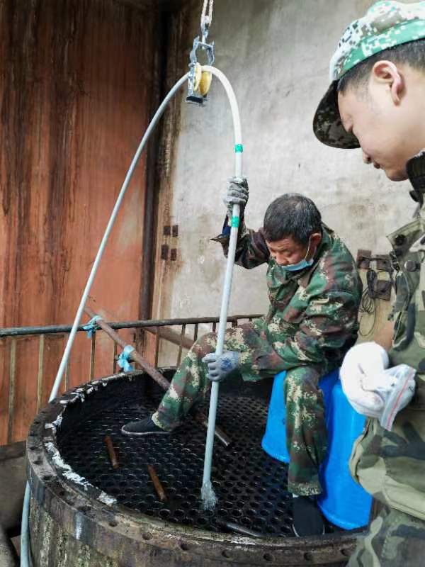 2022年5月28日黑龍江省哈爾濱市呼蘭區(qū)康金鎮(zhèn)小趙村哈爾濱市盛大化工有限公司在費總的精心安排下,孫總親自坐鎮(zhèn)指導,生產廠長潘峰與河南都市機械設備有限公司喬主任,都紅植技師密切配合,徹底了解GQ-600型智能清洗機的性能和特點,使用600型智能清洗機四個要點1,不能缺水,要使用干凈的靜水,2,過載保護扭力限制器要調到,軟軸跳動可以自動停下來,不然既不安全,又失去他的意義,3,軟軸要放平拉直,順勁擺放,不能打死彎,盡可能防止扭軸斷軸,4,鉆頭要大小適當,太大了容易卡軸扭軸斷軸,并且一定要直對疏通管道口。三天時間打通清洗了兩臺徹底堵死好、結垢堅硬的污水蒸發(fā)器,廢水蒸發(fā)器,沒有損壞一根軟軸,沒有損壞一個鉆頭和配件,為糠醛行業(yè)增加了自信,減少了資金損耗,降低成本,提益,做出了標桿!